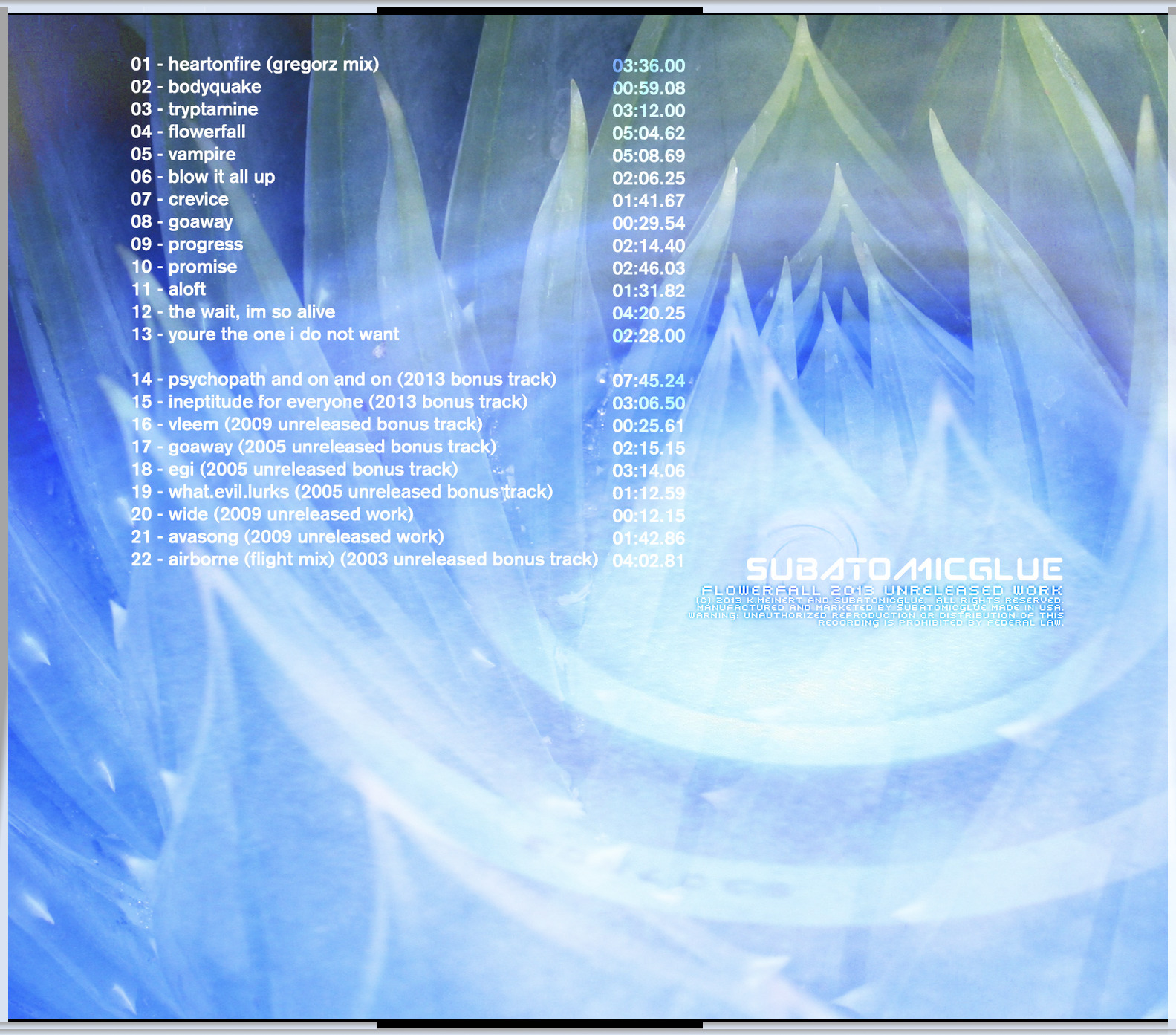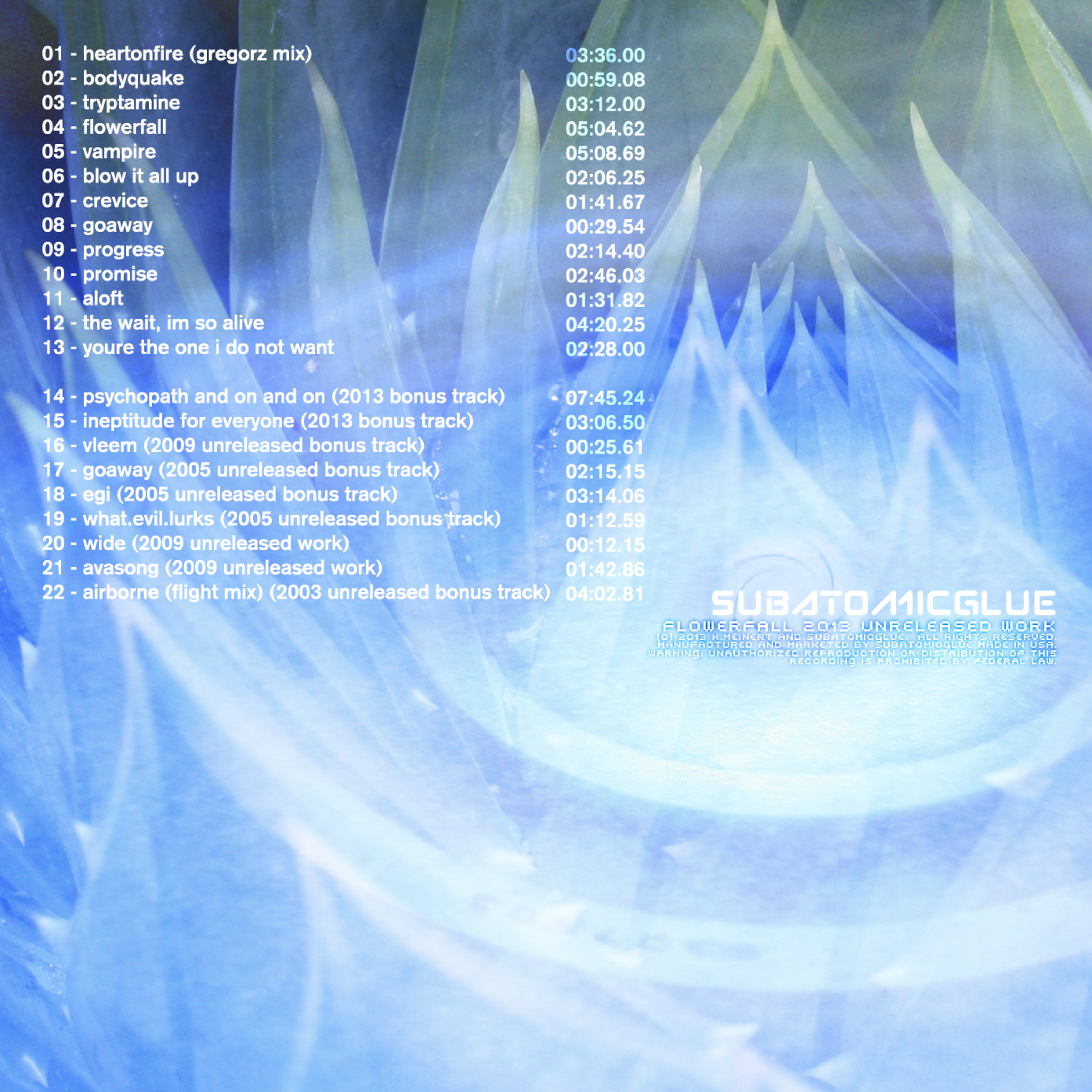 Welcome to the download area for subatomicglue's Flowerfall 2013 (unreleased work). You can also find more info, album notes, merch, buy music, follow us, news, and more flowerfall is the precursor to kevin meinert's superczartemple project, you can hear many early ideas as well as an early version of heart on fire. also included are several unreleased b-side tracks from the 2000's era 'selling your friend for cash' (egi, what evil lurks, goaway), 'spinning trees' (vleem, wide, ava's song), and 'aeonblue' (longer mix of airborne), plus 2 new 2011 bonus tracks (psychopath and on and on, ineptitude for everyone) |